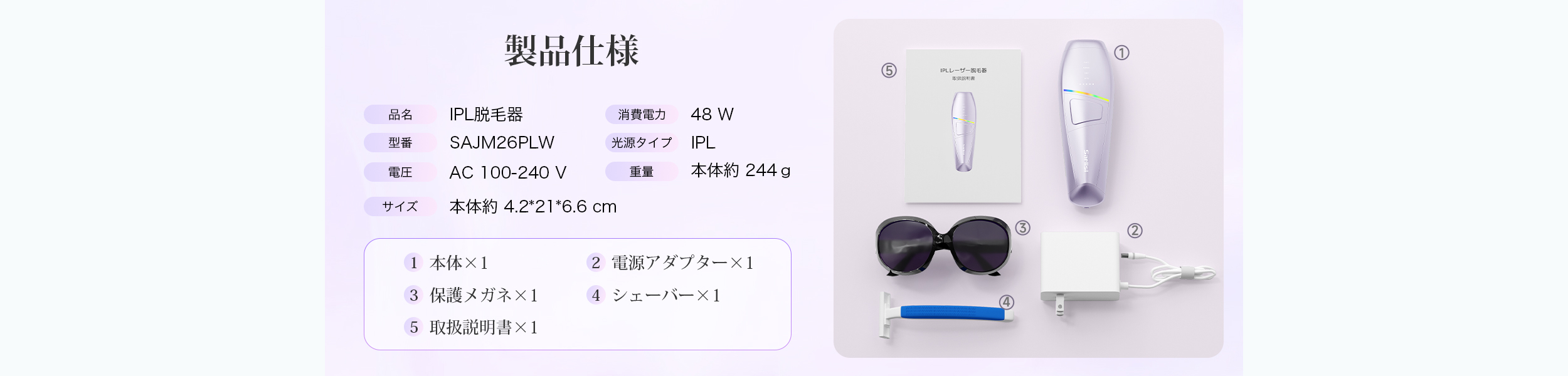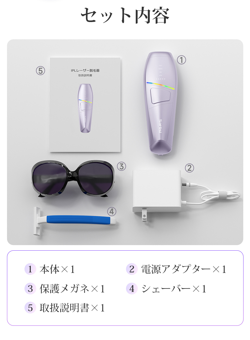 セット内容:本体、電源アダプター、保護メガネ、シェーバー、取扱説明書